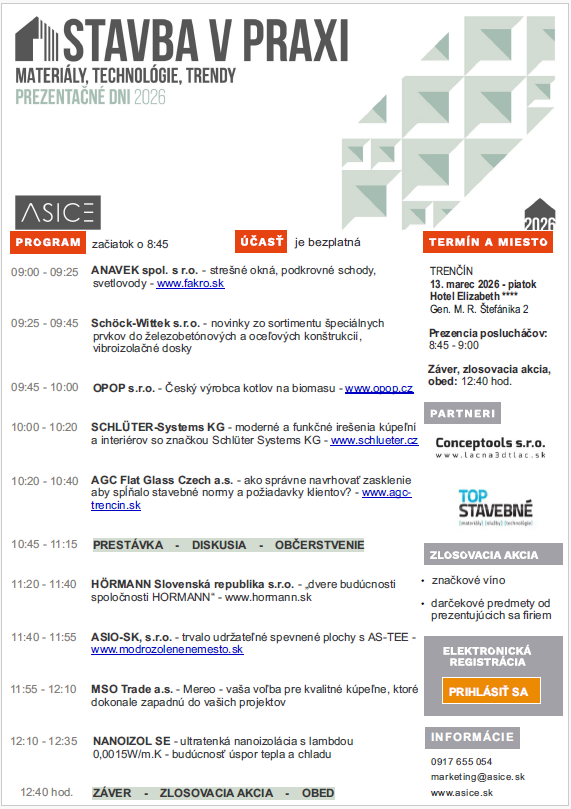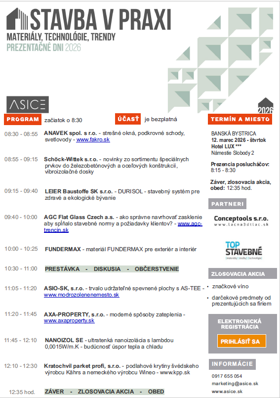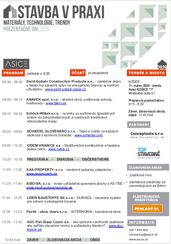 Pozvánka na Prezentačné dni STAVBA V PRAXI v termínoch 11. 3. 2026 v Košiciach, 12. 3. 2026 v Banskej Bystrici a 13. 3. 2026 v Trenčíne, téma Materiály, technológie, trendy, bližšie informácie v pozvánke.