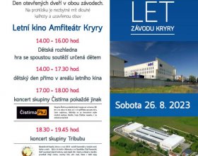 30. výročí od výstavby nového závodu v Kryrech si připomene v sobotu 26. srpna - v areálu AGC v Tovární ulici jsou od 9:30 do 13:00 připraveny prohlídky závodu. Upozorňujeme zájemce, že vstup je z bezpečnostních důvodů (práce se sklem) povolen pouze s dlouhými kalhotami a uzavřenou obuví. Na odpoledne je v letním kině připraven zajímavý rodinný program a koncert tří kapel. Program naleznete na plakátě níže.