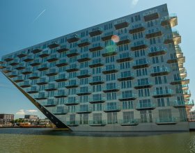Sluishuis je ikonický rezidenční projekt navržený architektonickými kancelářemi Bjarke Ingels Group a Barcode Architects, který se nachází na ideálním místě, kde se setkává město, krajina a voda v amsterdamské čtvrti IJburg. Pro skleněné plochy bylo vybráno sklo Thermobel iplus s vysoce izolačním distančním rámečkem, a to jak ve verzi s dvojsklem, tak i trojsklem. Výrazná fasáda vypínající se nad vodní plochou je osazena protipožárním sklem Pyrobel EI 60, které je dostatečně pevné, aby se po něm dalo chodit.